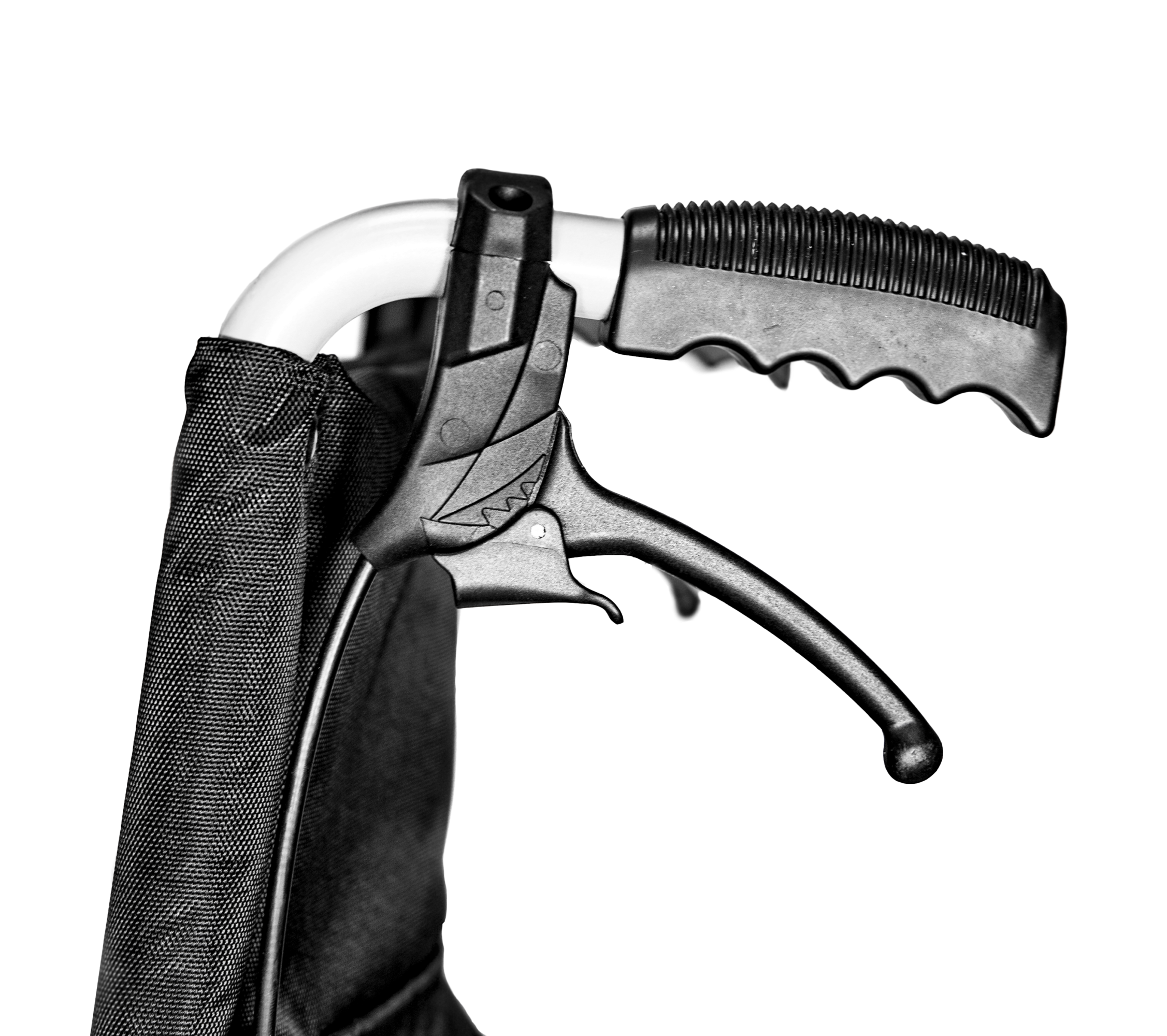 Vežimėlyje sumontuota dviguba stabdžių sistema – palydovo ir naudotojo. Ant stūmimo rankenų sumontuoti palydovui skirti stabdžiai gali sulėtinti vežimėlio greitį (ypač leidžiantis nuokalne) arba visiškai užblokuoti galinius ratus. Norėdami sulėtinti vežimėlį abiejomis rankomis vienu metu pakelkite stabdžių rankenėles į viršų. Norėdami užfiksuoti galinius ratus, kai stabdžių rankenėlės viršutinėje padėtyje, nulenkite žemyn laikiklius, esančius žemiau stabdžių rankenėlių. Vežimėlio naudotojo stabdžiai sumontuoti iš abiejų vežimėlio pusių virš galinių ratų, įjungiami ar išjungiami naudojantis specialia rankenėle. Norėdami įjungti stovėjimo stabdį stumkite rankenėlę nuo savęs, norėdami jį išjungti ir judėti rankenėlę patraukite į save. Stovėjimo stabdis privalo būti įjungtas sėdantis į vėžimėlį ar keliantis iš jo, tačiau juo negalima mažinti greičio.
