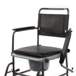 Juodos spalvos, klasikinio stiliaus tualeto kėdė su ratukais, pakojais ir blauzdas prilaikančiais diržais – praktiškas ir patogus pasirinkimas sunkiai judantiems asmenims arba tais atvejais, kai nėra galimybių naudotis įprastu tualetu.
